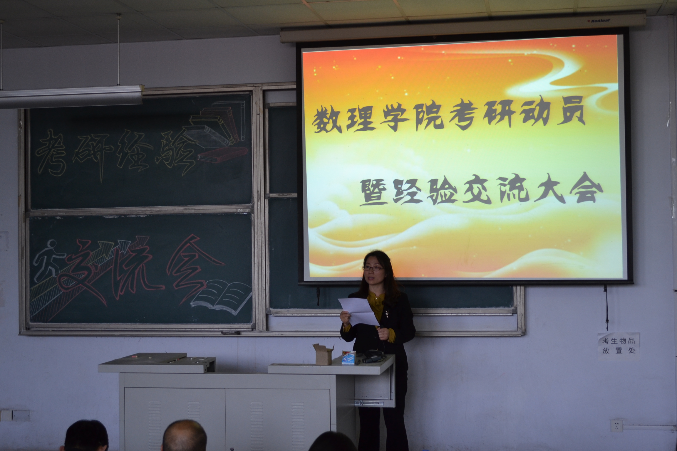 举办的考研动员暨经验交流大会在弘毅楼E区104教室举行。党总支书记王霞,副院长杨树国,党总支副书记兼副院长王丽,数学系主任王明辉,物理系主任郭广海,分团委老师苏靖文和六位已考取研究生的大四学生出席了本次会议,到场的还有12级、13级有考研意向的学生。