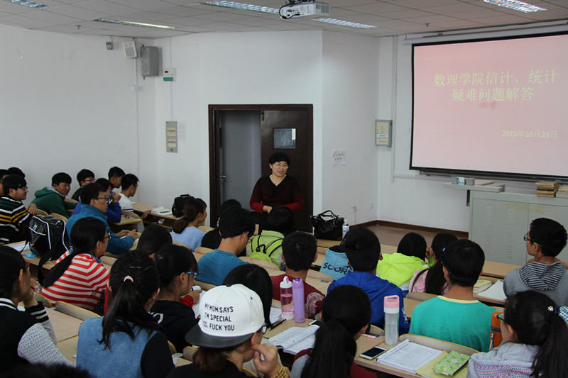 统计教研室主任李秀丽教授李老师对15级新生提出的有关专业问题的困惑,进行了专业的解答,正好李老师又是15级新生代数与几何的任课老师,李老师针对学生有可能会在学习上遇到的困难,在课堂上为同学们一一解答。