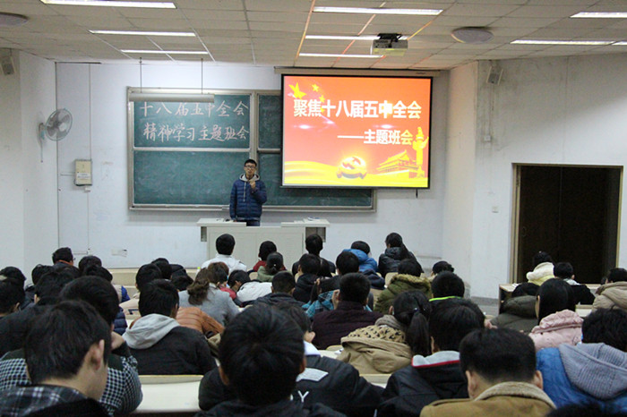 在全体同学中开展了“畅谈五中全会,共建和谐小康”主题团日活动。 同学们对会议提出的“信息经济”、“服务业开放”、“人口老龄化”、“生态环保”、“国企改革”和“军民融合”等十三五规划的关键词进行了热烈而广泛的讨论。大家表示要努力践行社会主义核心价值观,为实现中华民族伟大复兴的中国梦贡献智慧和力量。