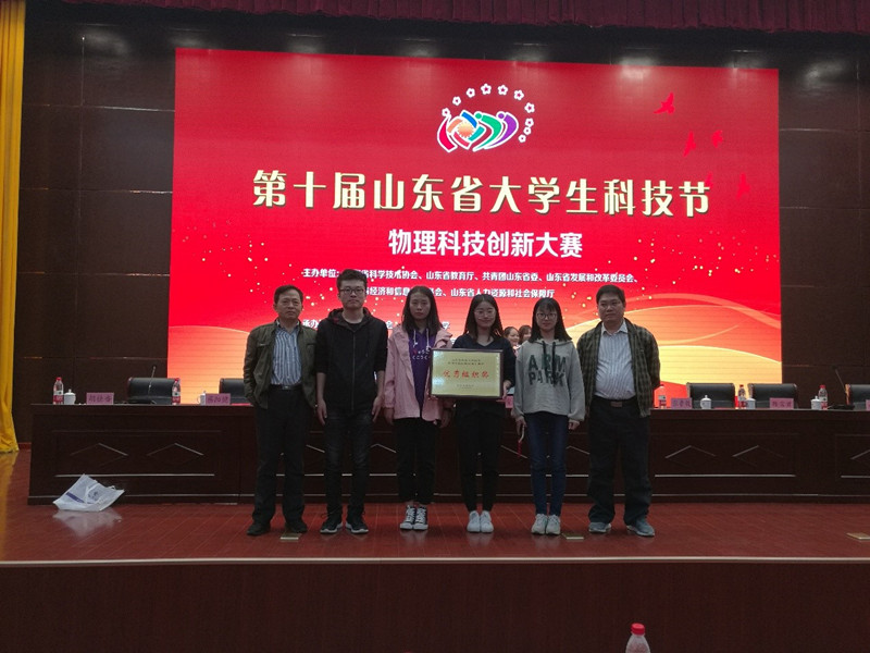 共有4组作品参加本次大赛并取得了优异成绩,获一等奖2项、二等奖2项。其中于燚、索嘉成、马云飞等同学的作品《定量研究非磁性旋转导体盘阻尼效应的实验演示装置》和崔玉倩、孟家锋、崔春祥等同学的作品《水槽式洛伦兹力演示实验装置》获得山东省一等奖;徐召来、傅雅君、李雨竹等同学的作品《空气磁导率的测定》和张志远、苗一凡、徐建一等同学的作品《新型导热系数教学实验测量仪器演示仪》获得山东省二等奖。杨清雷老师获得“优秀指导教师”称号,天博体育获得“优秀组织奖”。