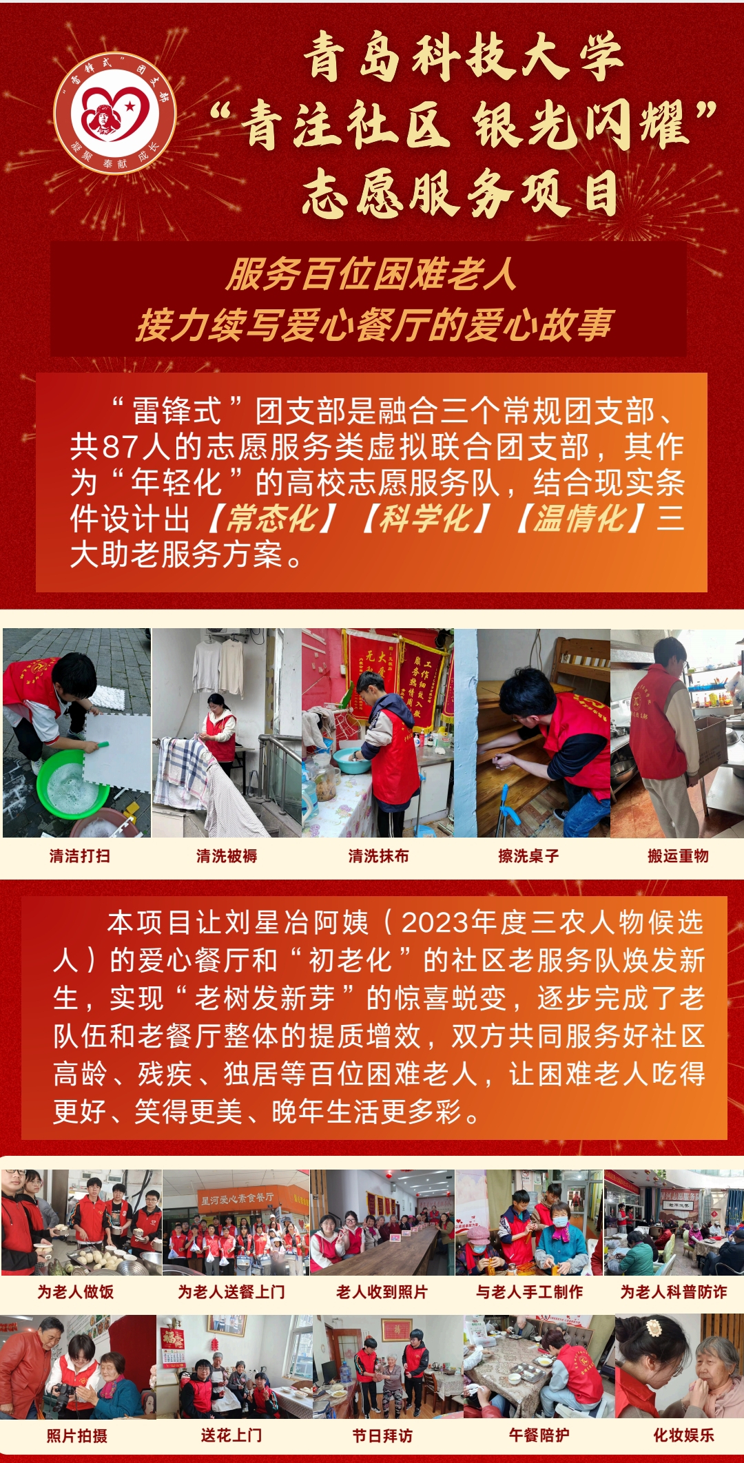 “雷锋式”团支部申报的“青注社区 银光闪耀”志愿服务项目获得大赛铜奖。项目聚焦“青助老”,“雷锋式”团支部作为“年轻化”的高校志愿服务队,结合现实条件设计出【常态化】【科学化】【温情化】三大助老服务方案,让刘星冶阿姨(2023年度三农人物候选人)的爱心餐厅和“初老化”的社区老服务队焕发新生,实现“老树发新芽”的惊喜蜕变,逐步完成了老队伍和老餐厅整体的提质增效,双方共同服务好社区高龄、残疾、独居等困难老人,让困难老人吃得更好、笑得更美、晚年生活更多彩。