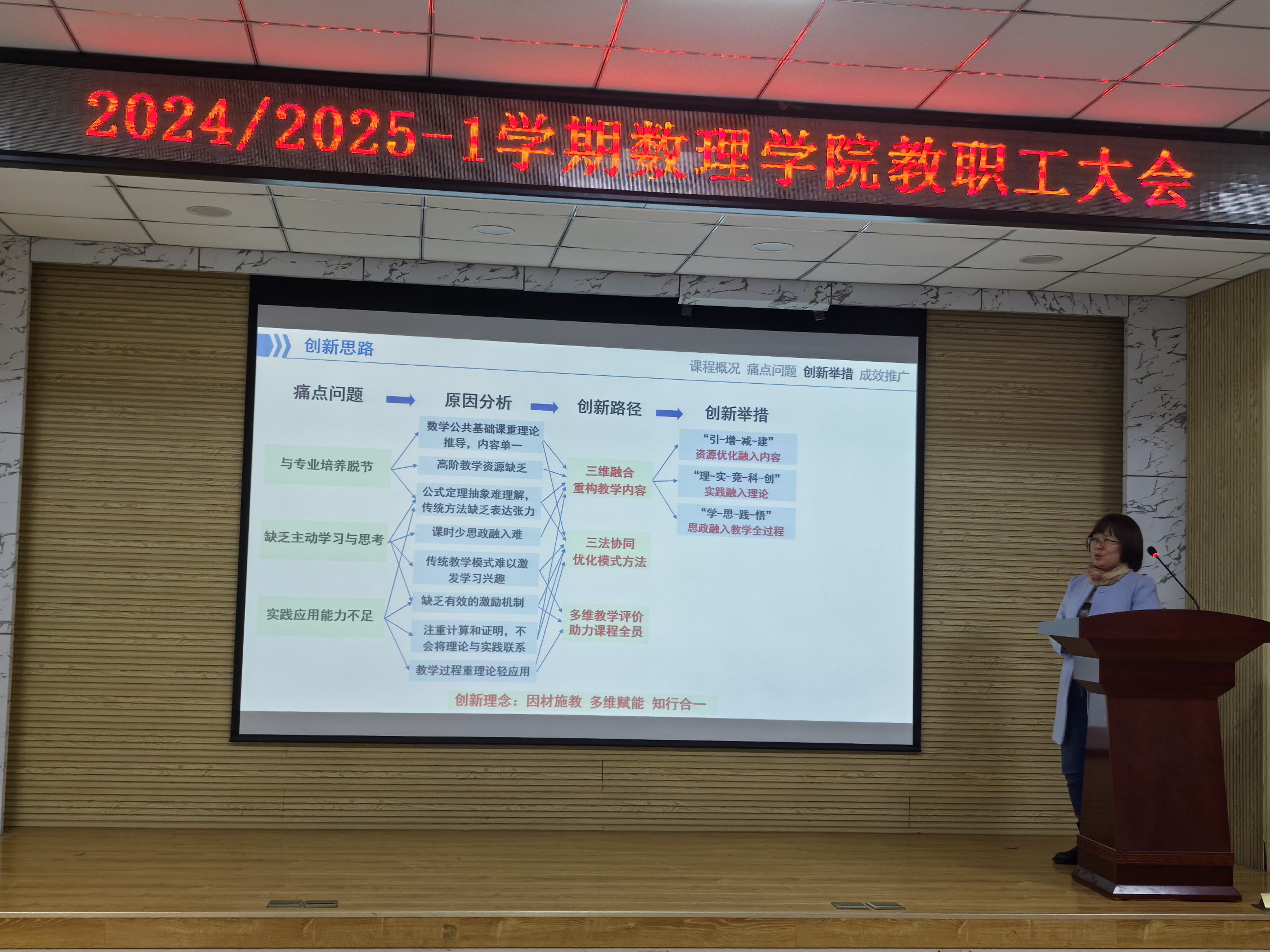 整体教学水平的提升。王建新副教授以“跨专业融合下数学思维的构建”为主题,分享了她在概率论与数理统计课程中的教学创新。她强调通过优化专业需求的教学资源,将实践与理论相结合,融入思政元素,构建三维融合的教学模式,以夯实数学基础,并进行高阶知识的探究与应用。该课程教学方法包括“交互研讨、设疑启思、上云用数”,以优化教学模式,因材施教,培养学生的思辨与实践创新能力,为新工科人才的培养奠定基础。