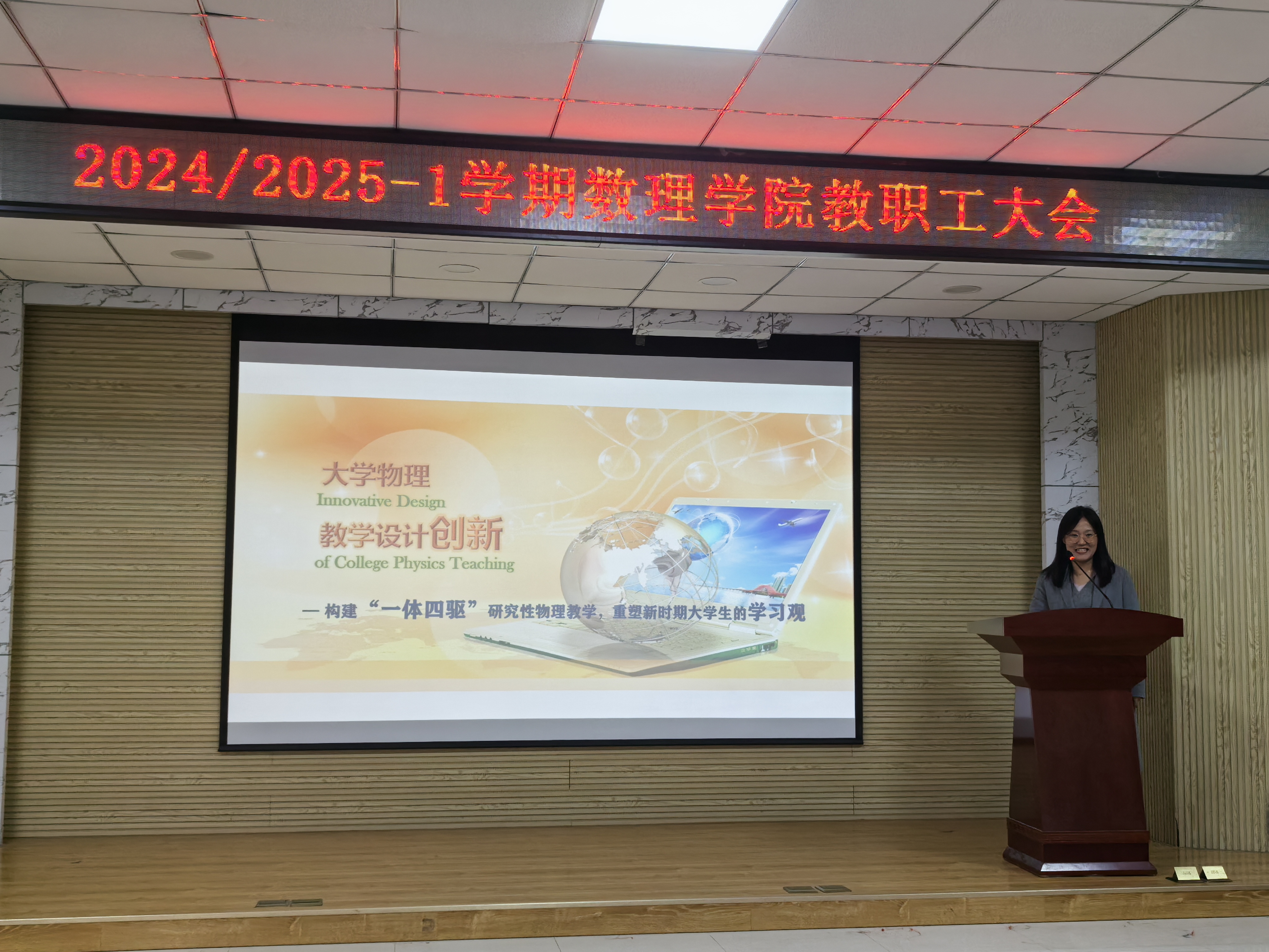 山东省教师教学创新大赛一等奖获得者王红霞副教授以“构建一体四驱研究性物理教学模式”为主题进行了大学物理教学创新汇报。她结合时代特点和课程目标、学情等情况对教学痛点进行了深入分析,并从教学内容、设计、方法和过程等方面展开创新。基于“大问题”和“小问题链”模型的教学设计和教学方法直击痛点,为物理课程教学改革提供了可以借鉴的思路和方法。