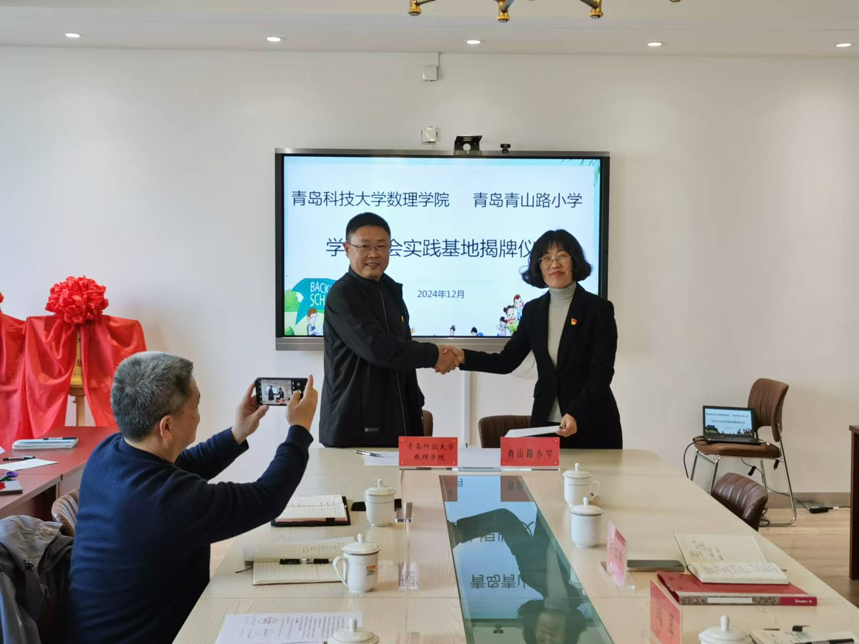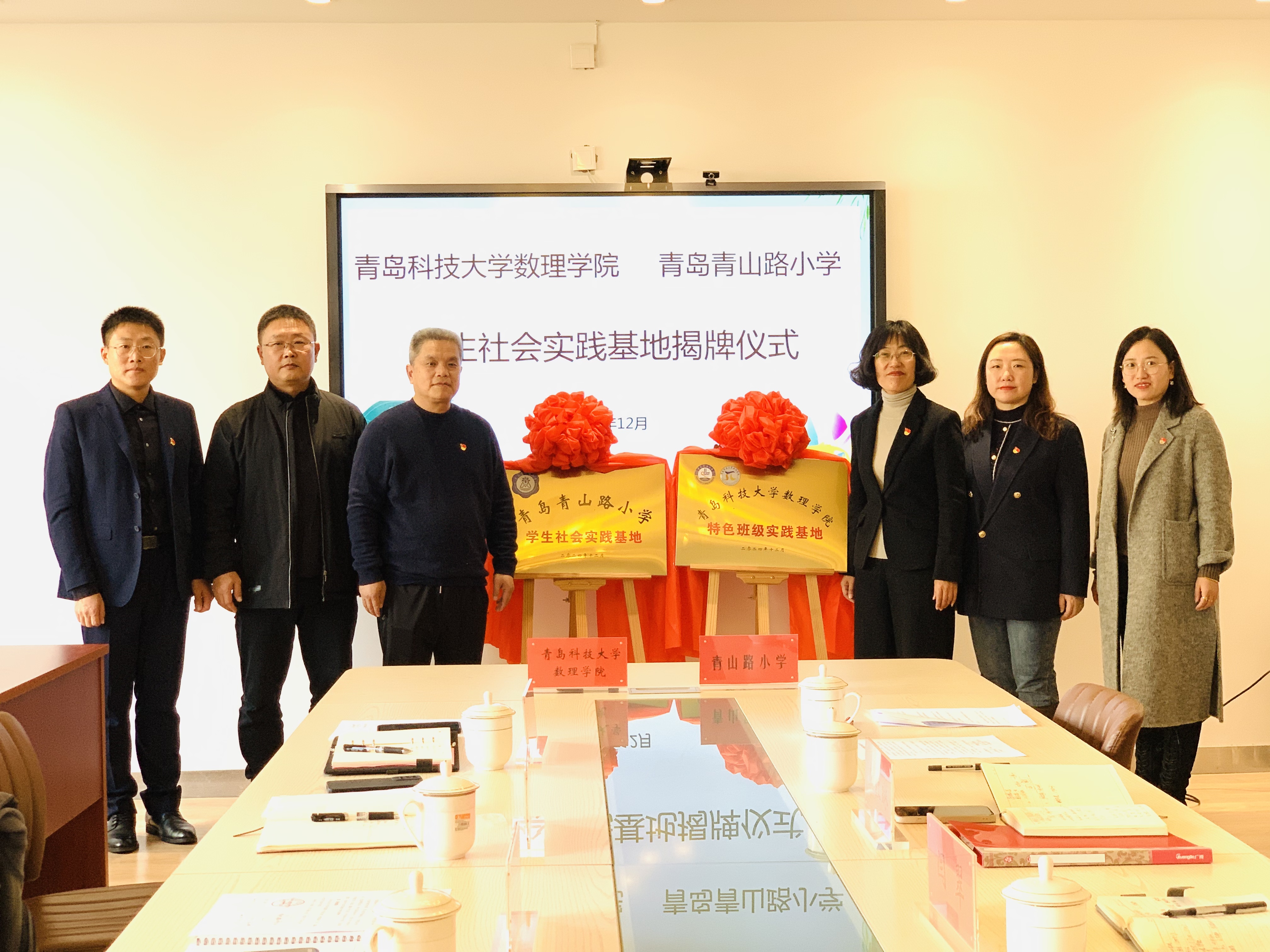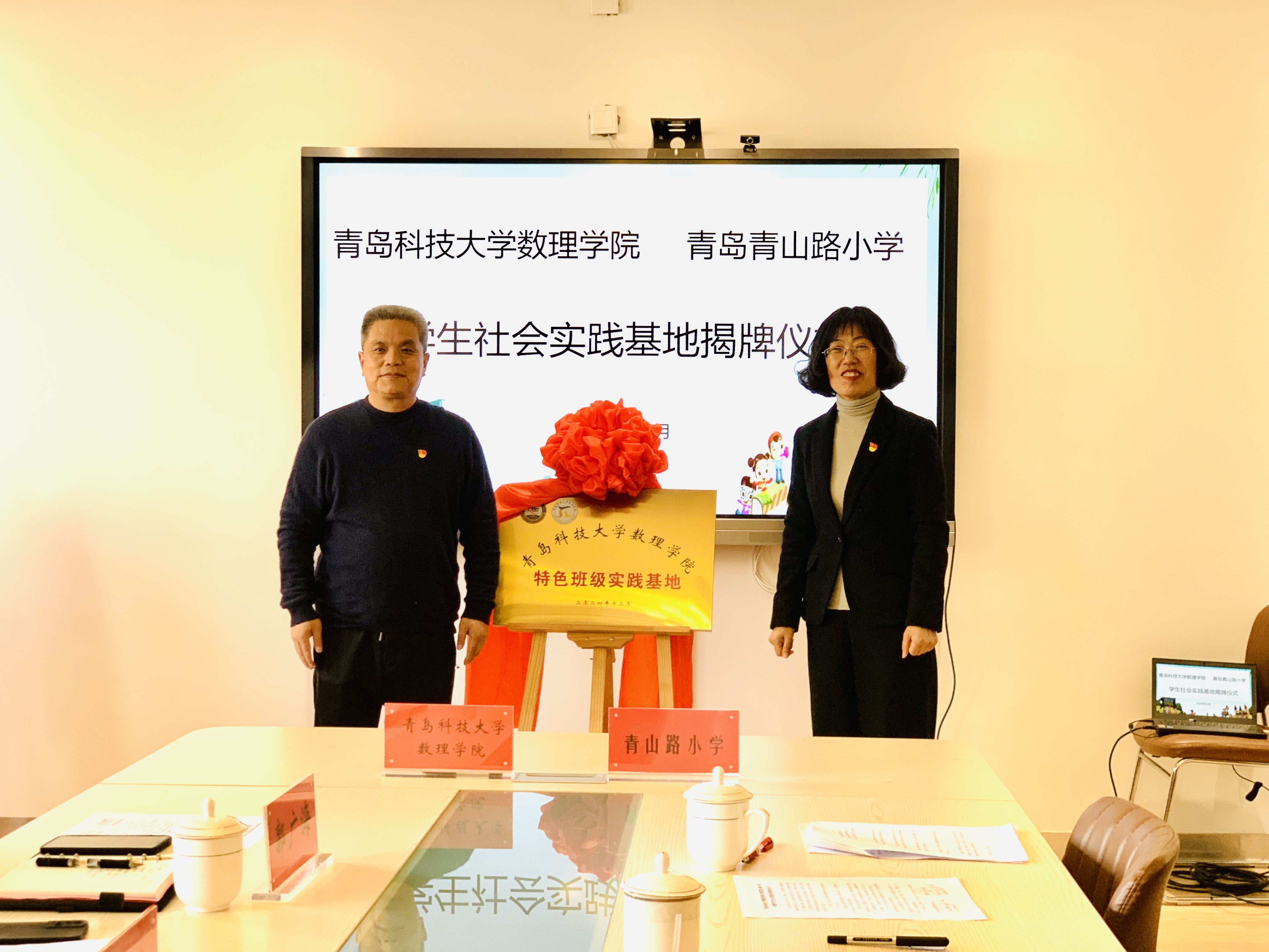 特色班级实践基地”“青岛青山路小学学生社会实践基地”揭牌。此次共建合作以“党建引领发展,结对共筑未来”为主题,通过加强双方在教育领域的交流与合作,共同推动高校与小学党建工作的新思路和新方法,实现新时期高质量发展。合作内容包括党建交流共促组织建设、党建搭桥共促大中小学思政一体化建设以及党建纽带共促人才培养等方面。