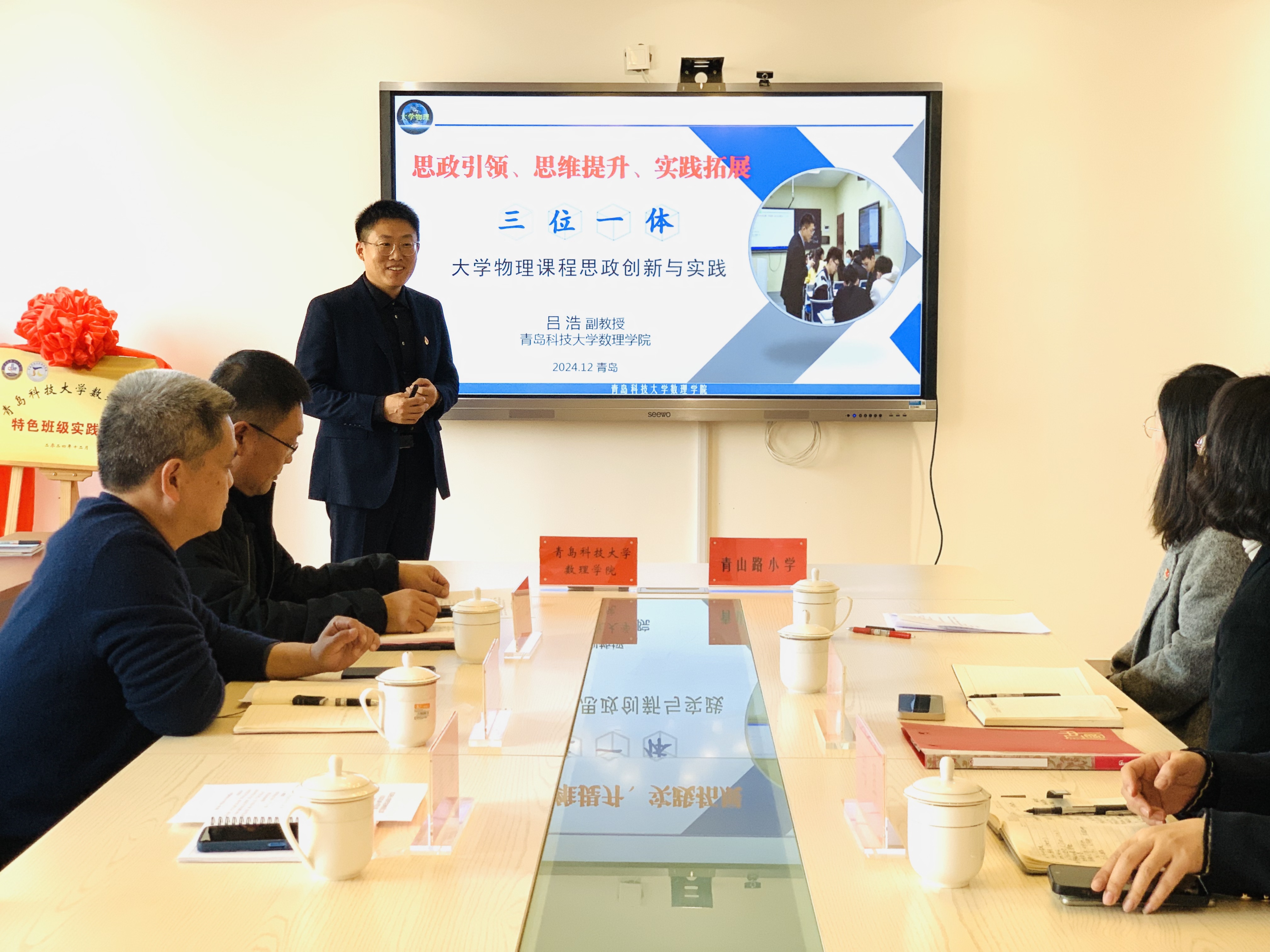 党委书记刘保成、副院长郭广海、物理系党支部书记吕浩和青山路小学党支部书记、校长车红琳参加会议。