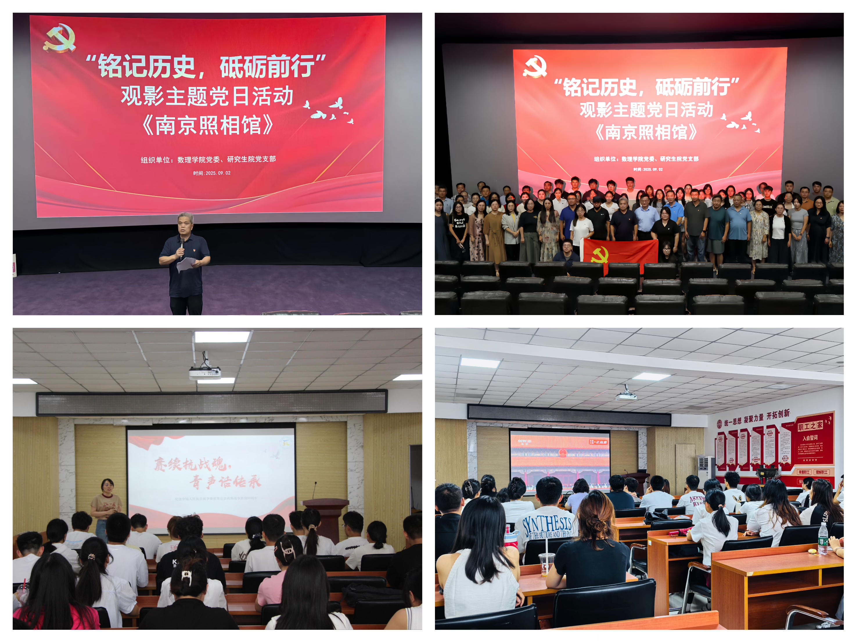 党委组织师生党员集体观影《南京照相馆》,通过光影重温历史、汲取奋进力量,各支部分别开展“铭记历史、开创未来”主题党日活动。组织师生集中收听收看学习纪念中国人民抗日战争暨世界反法西斯战争胜利80周年大会直播,激发爱国热情。学生会、研究生会举办抗战知识竞赛,围绕抗战历程、英雄事迹等内容设计历史问答,营造了知史爱党、知史爱国的浓厚氛围。师生代表成立宣讲团,深入各团支部开展专题宣讲,用青年话语讲述抗战故事、阐释精神价值,推动抗战精神在青年中内化于心、外化于行,实现红色基因的代际传承。学生党员张梦表示:“通过参加活动我更加深刻地体会到抗战精神的伟大,纪念大会上亮相的一系列“大国重器”,集中展示了我国高端装备制造领域的重大突破与创新成就。作为新时代的青年学子,我们既要铭记历史、致敬先烈,更要将爱国主义情怀转化为科技报国的实际行动,积极投身科研创新,把专业所学与国家战略需求紧密结合,以青春智慧助力民族复兴伟业。”