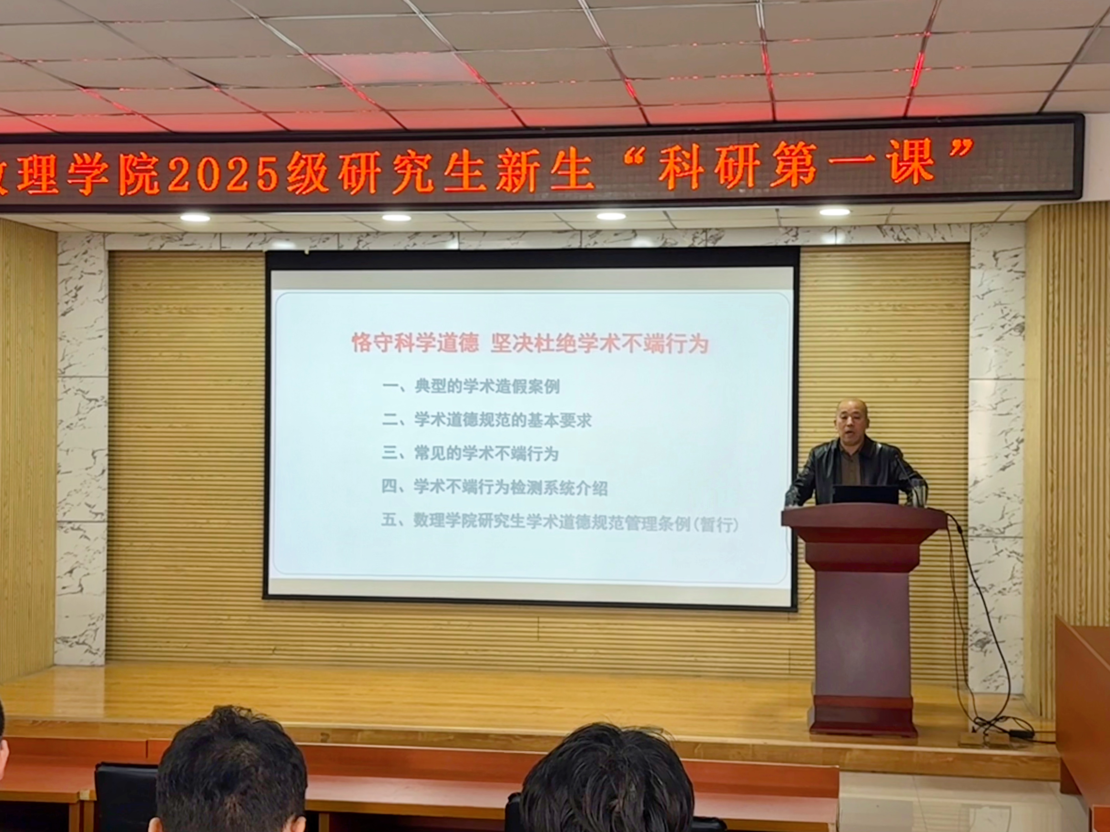 杨树国作题为“恪守科学道德,坚决杜绝学术不端行为”专题讲座,结合数理学科的科研特点与国内外学术界的典型案例,深刻剖析了学术不端行为的各种表现形式及其带来的严重危害,为同学们划清了学术研究的“红线”与“底线”。他强调,研究生教育是培养高层次创新人才的重要途径,学术诚信则是学术创新与发展的基石,全体新生从入学起就要树立起崇高的科学道德观,将学术规范内化于心、外化于行,在未来的科研道路上,既要勇于探索、敢于创新,更要敬畏规则、坚守底线,努力成长为一名德才兼备、堪当大任的优秀科研人才。讲座内容丰富、论述精辟,既有理论高度,又富有现实指导意义,在现场新生中引起了强烈反响和深刻思考。