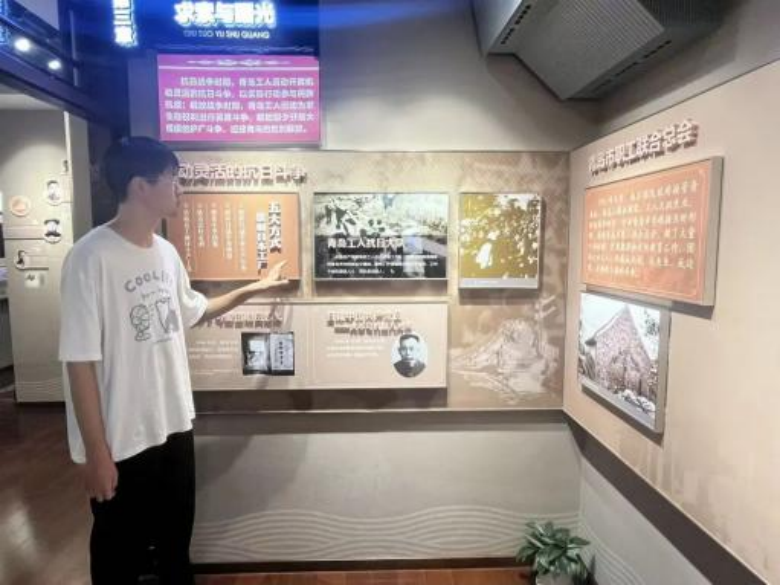 在讲解员的带领下,研究生志愿者们依次参观了四大展厅。“艰难历程中的青岛工运”展厅展现了邓恩铭、王尽美等革命先驱领导工人运动的英勇事迹,让人们深刻体会到早期工人阶级在压迫下的顽强抗争;“新中国的主人翁”展厅则通过许振超等劳模的故事,诠释了工人阶级在社会主义建设时期的担当与奉献;“改革开放的主力军”和“新时代的青岛工运”展厅,分别呈现了工人阶级在改革开放浪潮中勇立潮头以及在新时代砥砺前行的精神风貌。