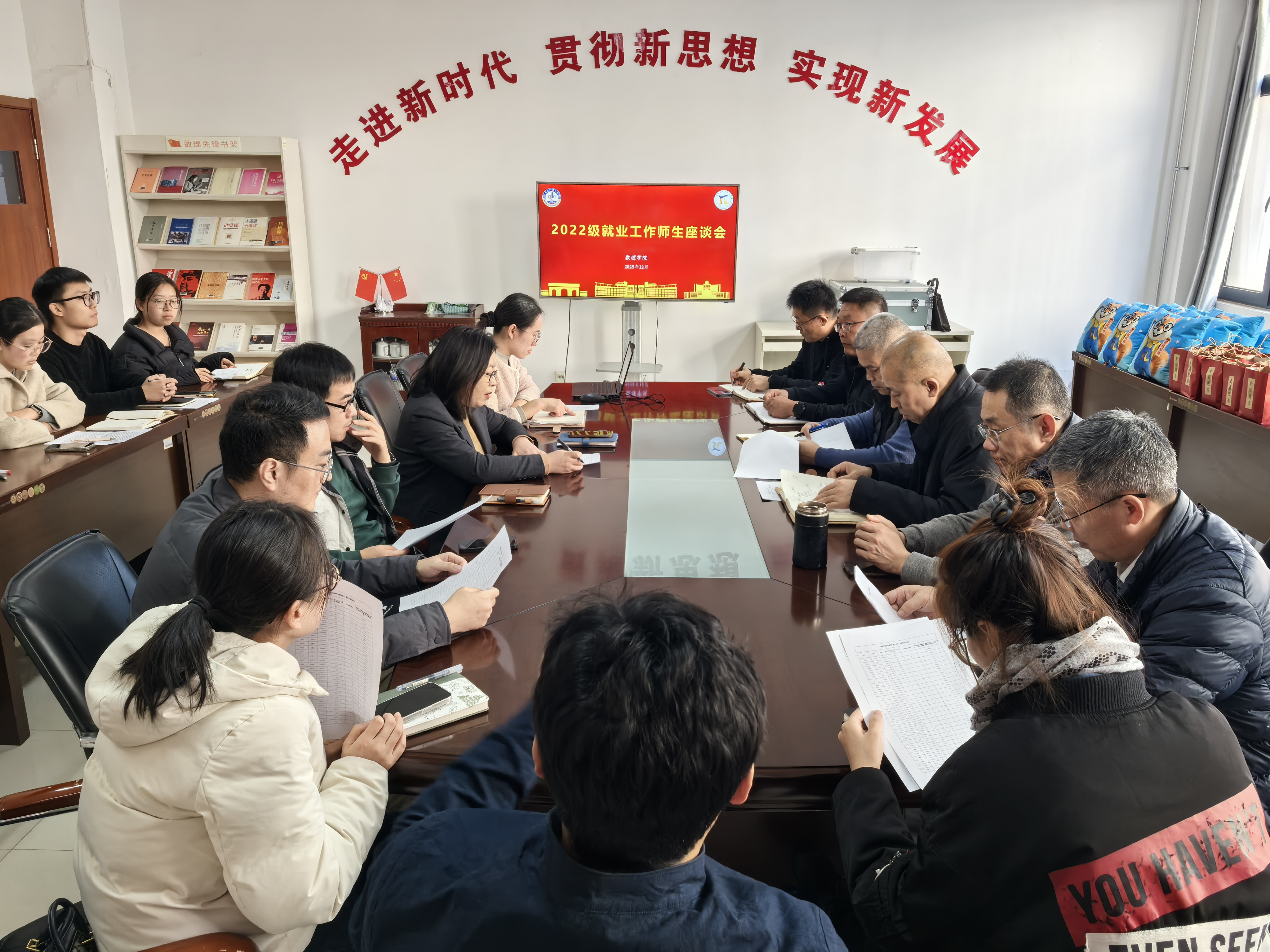 近期就业工作的推进情况。班长卢航等学生代表依次汇报了班级就业动态与同学们的实际状态,并反映了工作开展中遇到的困惑与需求。与会教师围绕职业规划引导、困难群体帮扶等问题展开讨论。