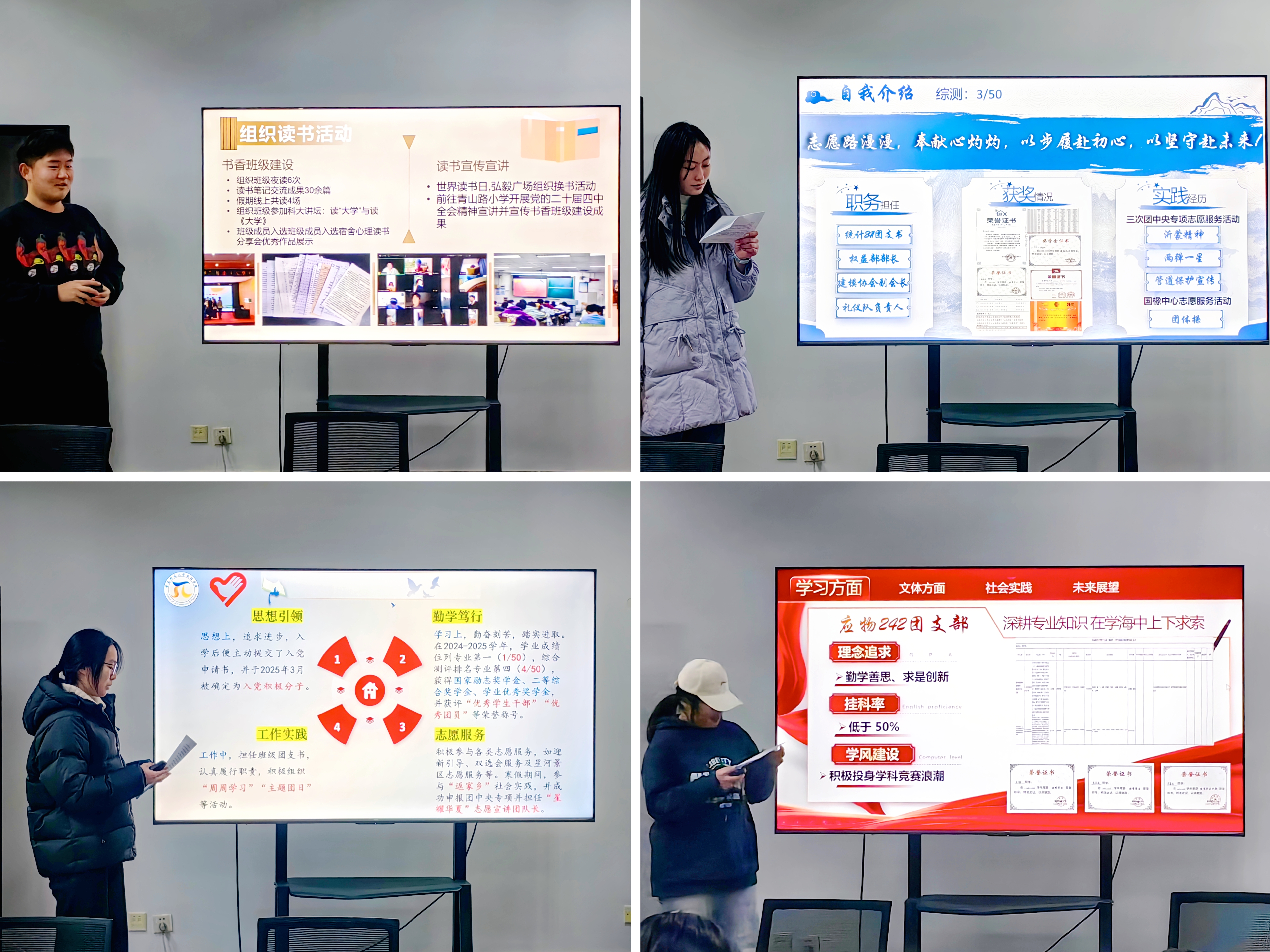 会议以“述履职、展特色、谋新篇”为主线,采取“一述一评”的方式进行。会上,各位学生骨干紧扣学科特色,依托“科普班级”“书香班级”“雷锋式团支部”建设载体,生动展示了在学风引领、实践服务及文化育人方面的阶段性成果。述职中,大家坚持问题导向,结合具体案例深入剖析了当前工作中存在的不足,明确了未来的计划与努力方向。