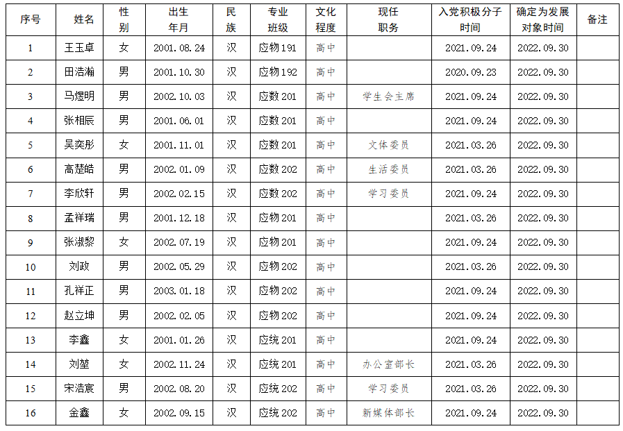 经天博体育 学生党支部研究讨论,天博体育 党委审核,拟确定王玉卓等16名同志为党员发展对象,现公示如下,如发现公示对象有不符合党员条件方面的问题,可在公示期内实名反映。