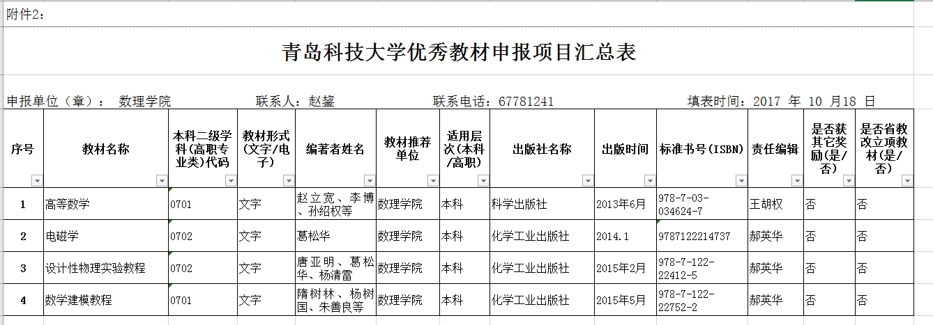 根据教务处《天博体育 关于开展2017年优秀教材评选工作的通知》安排,依据《2011年-2015年天博体育 出版教材统计汇总表》,教材第一主编(或第一编者)按要求提交《天博体育 优秀教材申报书》,天博体育 于2017年10月20日上午在天博体育 小会议室对符合申报条件的教材进行初评,按50%比例择优推荐。