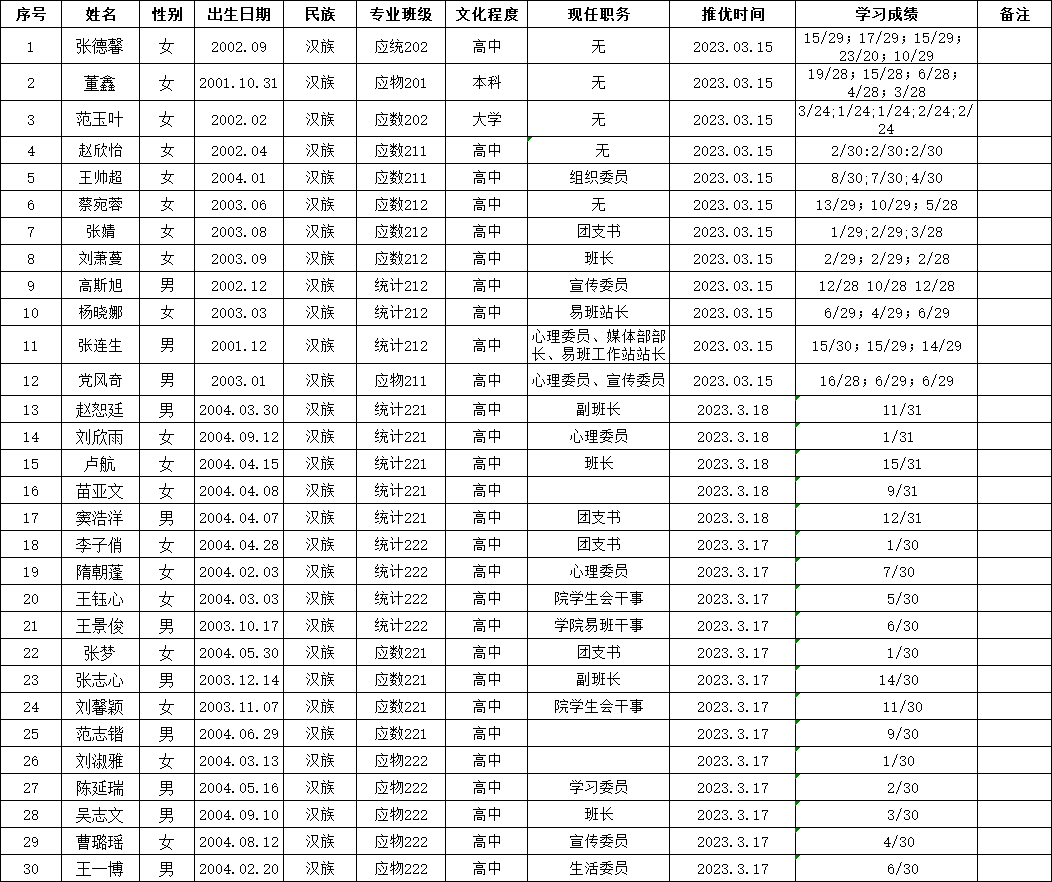 经天博体育 本科生各团支部全体团员大会讨论推荐,天博体育 团委研究决定,拟定推荐张德馨等30名同学为入党积极分子,现公示如下,如有异议,可在公示期内来电反映。