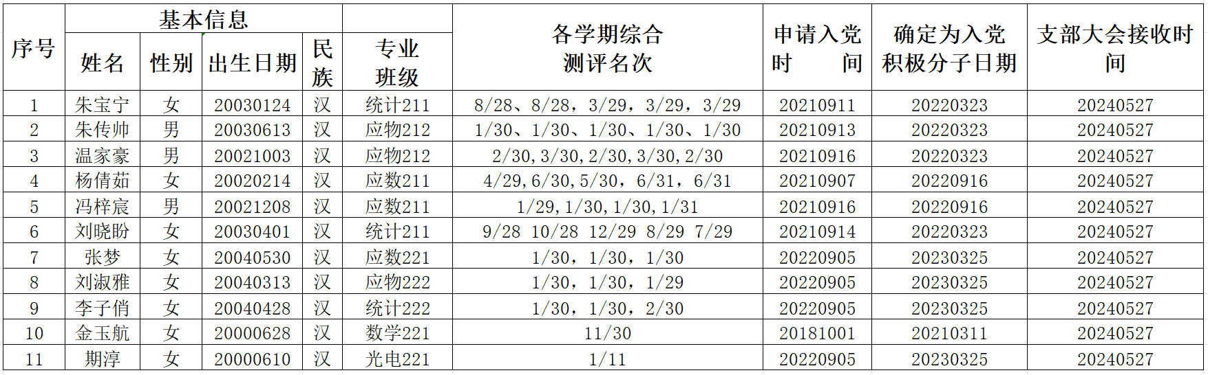 根据本人申请,党组织培养,经天博体育 学生党支部、研究生党支部委员会研究、支部大会讨论并无记名投票表决,拟吸收朱宝宁等11位同志为中共预备党员,现将其有关情况予以公示。