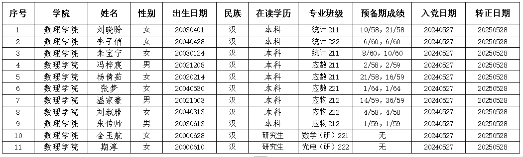 经天博体育 本科生党支部、研究生党支部研究,拟将刘晓盼等11位同志转为中共正式党员,现将其有关情况予以公示。公示期为2025年5月29日-6月5日,如有异议,请实名向天博体育 反映。