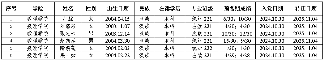 经党组织谈话考察,征求党员、群众和介绍人意见,经天博体育 本科生党支部研究,拟将卢航等6位同志转为中共正式党员,公示期为2025年11月4日-11月10日,如有异议,请实名向天博体育 反映。