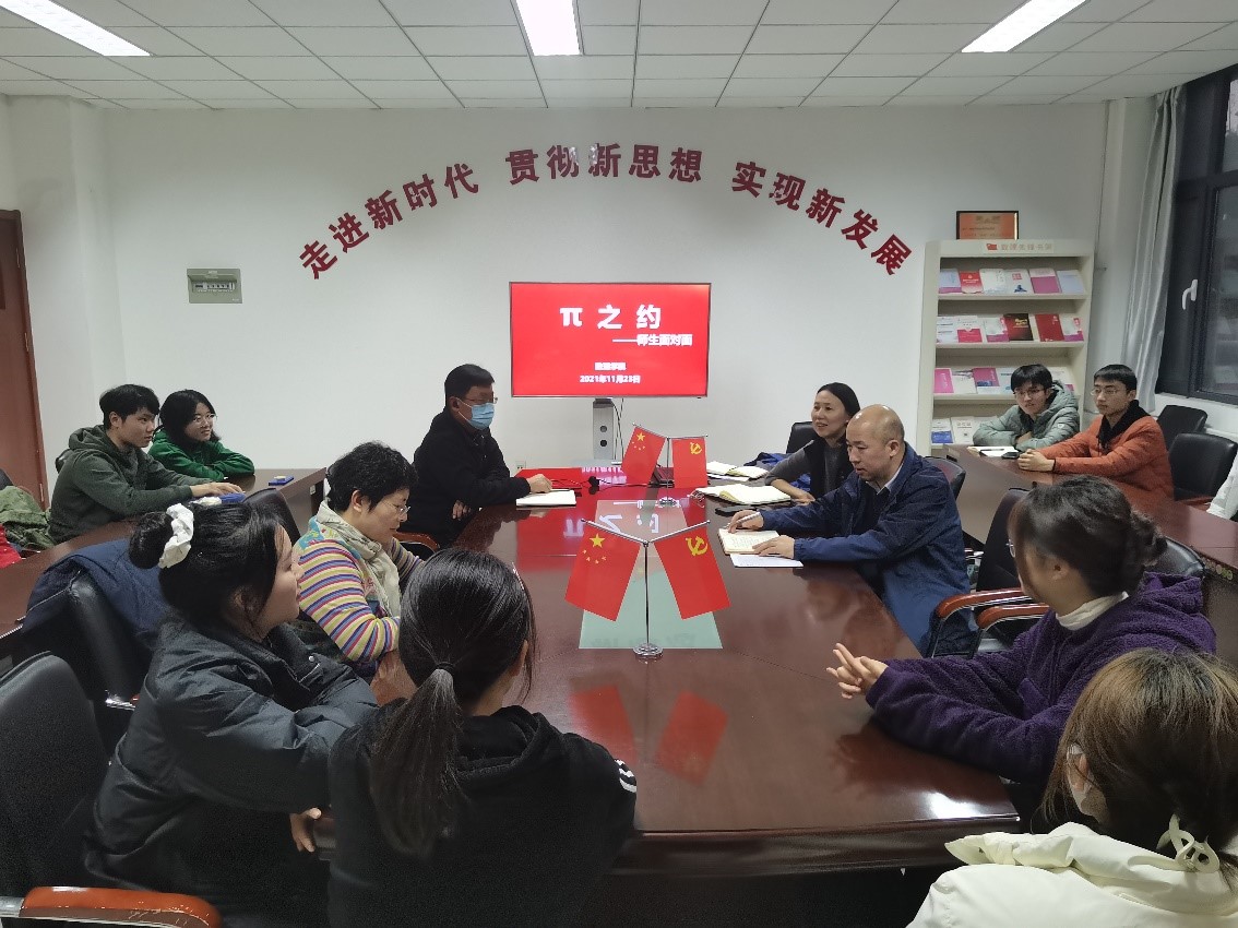 会议室举办“π之约”——师生面对面,院长杨树国、党委书记李淑贞、副院长王明辉、副院长郭广海、数学系主任李秀丽、物理系副主任王茂榕、学工办主任李磊,部分2021级学生代表参加座谈会。