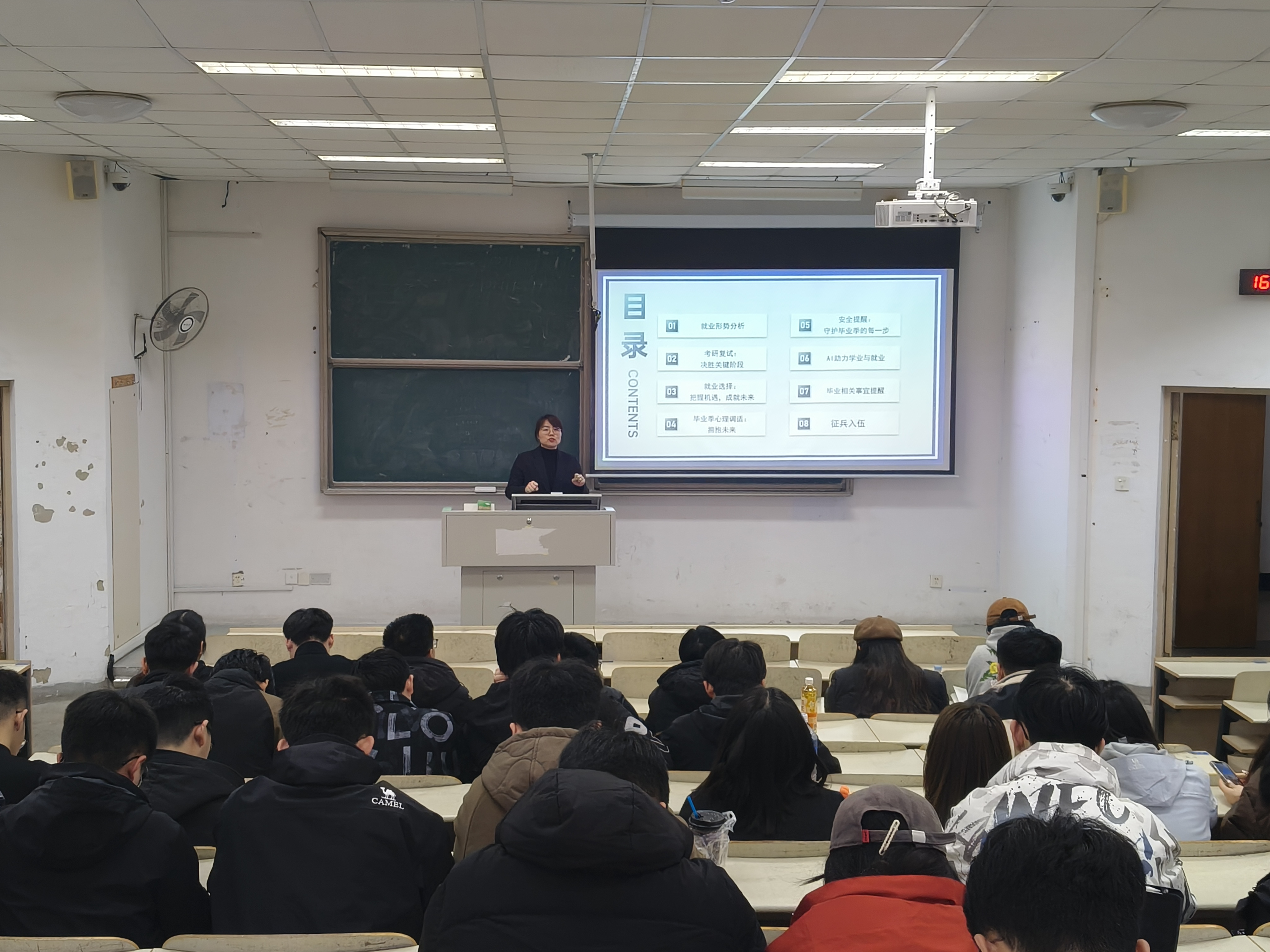 毕业生辅导员付凯主持,全体毕业生参加此次会议。会议围绕就业形势分析、考研复试、就业选择、征兵入伍、毕业季心理调适、安全提醒、AI赋能等七个主题展开,为毕业生们带来了一场干货满满的“及时雨”,帮助毕业生们认清当前就业形势,明确未来发展方向,做好考研复试和就业准备,以积极的心态迎接毕业季的挑战。